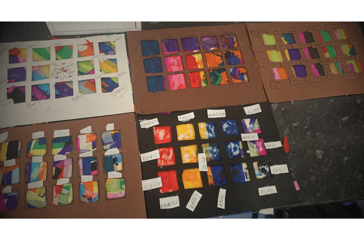A tabletop displays several grids of colourful, abstract painted squares on brown, black, and white paper, some labelled with small white tags. A white box sits in the top left corner.